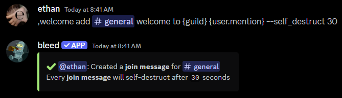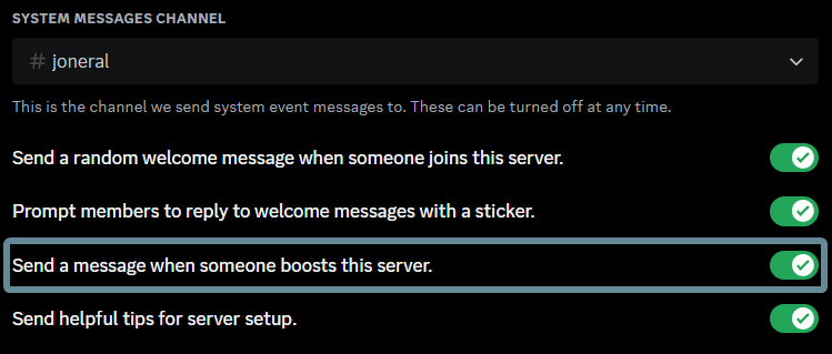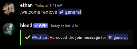 There are three system message commands, each with the same subcommands.welcome- Dispatched whenever a user joins the server.goodbye- Dispatched whenever a user leaves the server.boost- Dispatched whenever a user boosts the server.