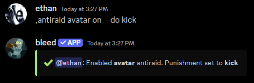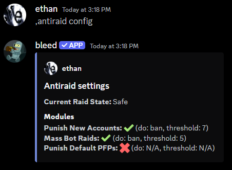 You can use theantiraid config command to view the current antiraid configuration.