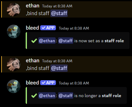 Use the ,bind staff @role command to set a role as a staff role, you would re-run the command if you don’t want a role set as staff anymore.